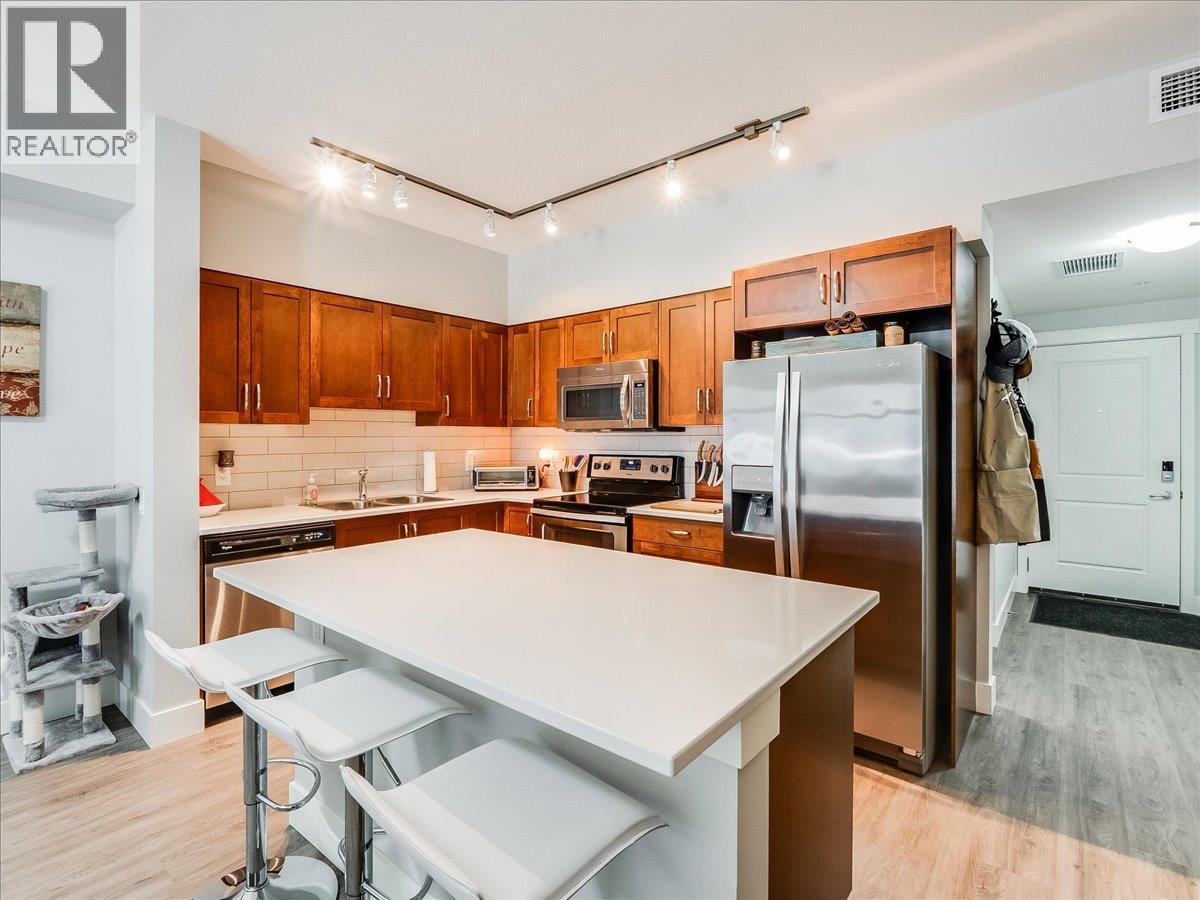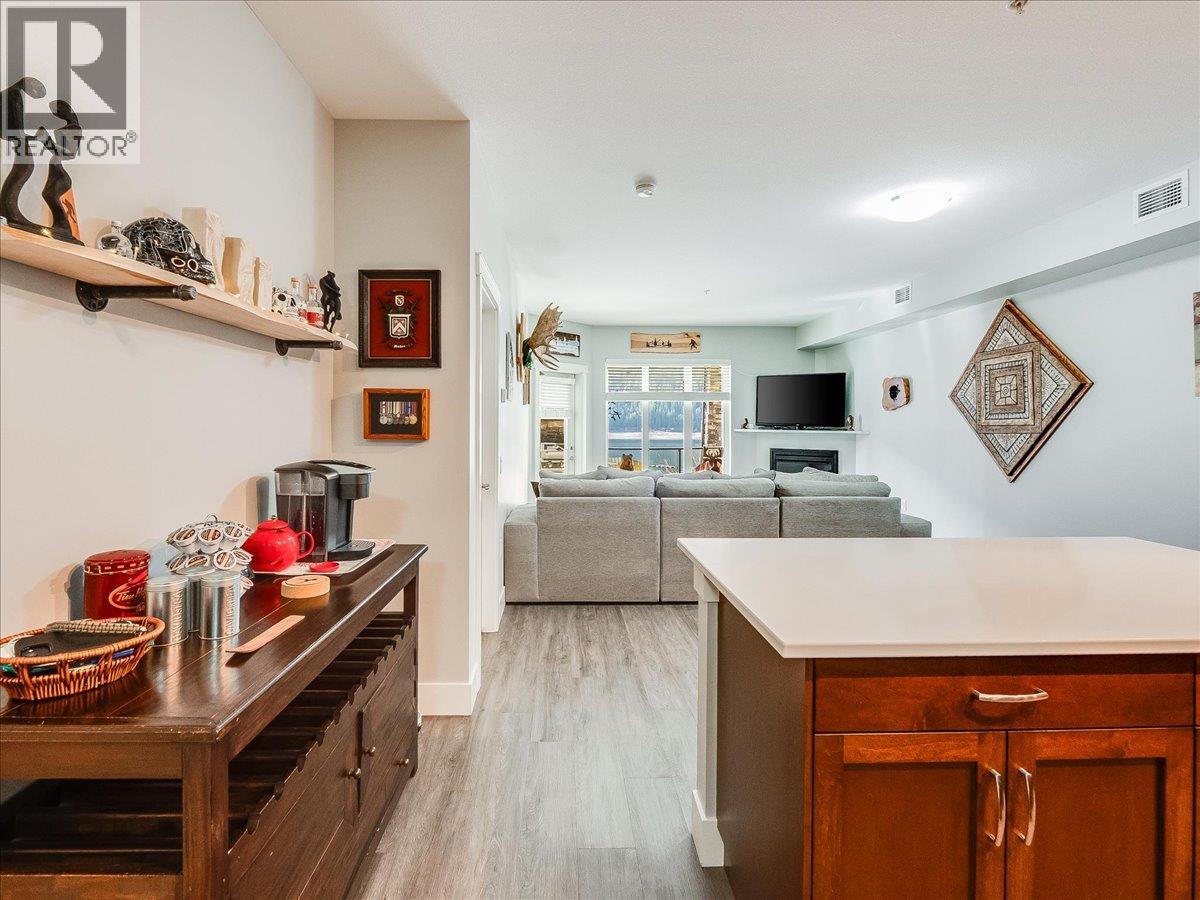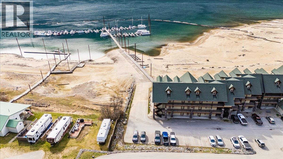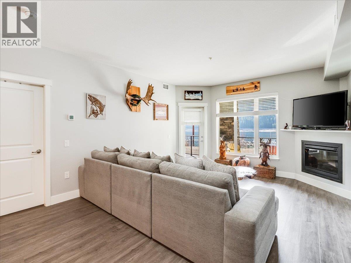 This stunning waterfront condo delivers the lifestyle you’ve been dreaming of. From the moment you arrive, it feels like a peaceful retreat where relaxation comes naturally and every day feels like a getaway. Inside, the bright, open-concept design is ideal for hosting friends or simply enjoying your own space. Soaring 9-foot ceilings and large windows fill the home with light and create an airy, spacious feel. The thoughtfully designed kitchen features ample cabinetry, generous counter space, stylish lighting, and a full set of stainless steel appliances—perfect for both everyday living and entertaining. The living and dining areas are comfortably sized, offering room for your furniture, while the inviting fireplace adds warmth and charm without the hassle. Step outside onto a covered deck that can be enjoyed year-round. The primary bedroom accommodates a king-sized bed and includes double closets along with a private four-piece ensuite. This larger two-bedroom layout provides excellent separation between the primary and guest rooms, offering added privacy. Highlights include in-suite laundry, a dedicated utility room, and plenty of storage. For outdoor enthusiasts, the nearby marina offers year-round moorage, making it easy to enjoy boating, fishing, water sports, or simply exploring the beauty of the lake. This home combines tranquility with convenience. If you’re searching for a serene waterfront property with modern comforts, this is the perfect place to call home. (id:60292)