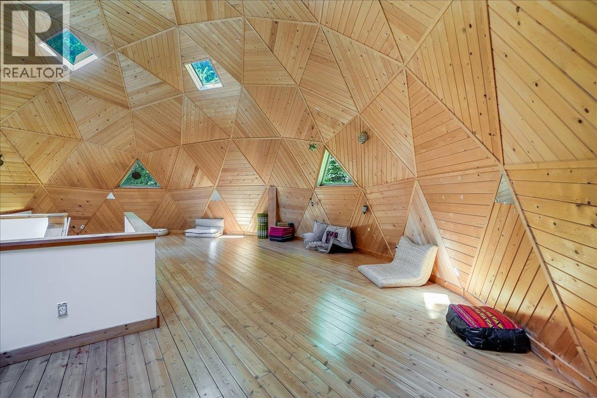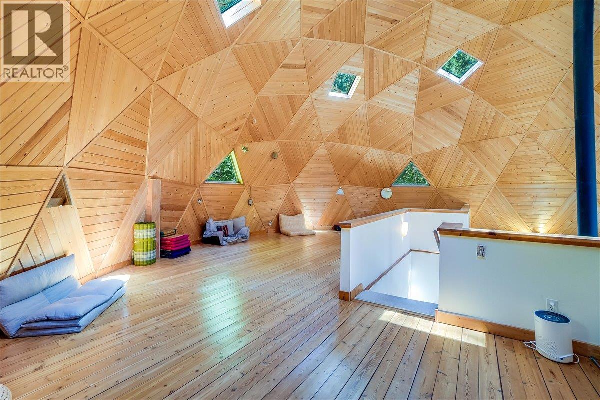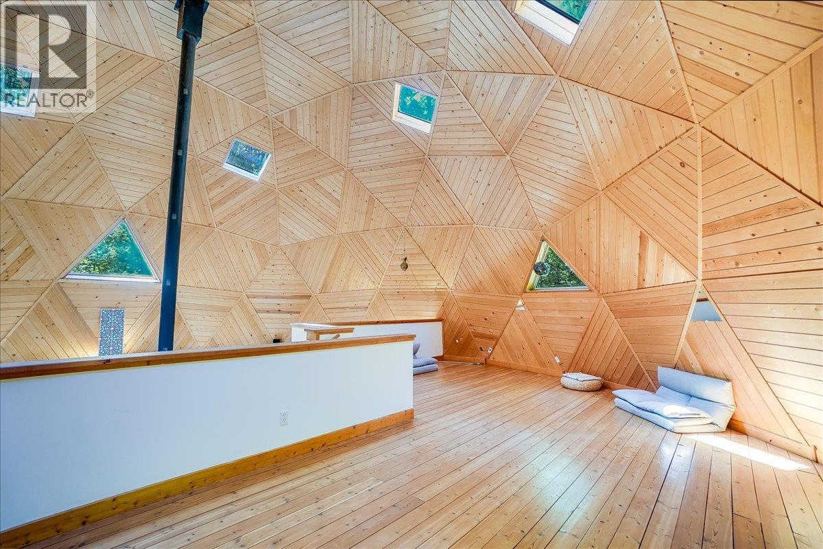 Welcome to your private retreat! Nestled on a 22-acre forested sanctuary just 20 minutes from Nelson, this gorgeous geodesic dome home offers endless possibilities. Built on an ICF - Insulated Concrete Form foundation, it’s designed for efficiency, comfort, and longevity. The main floor features a bright kitchen, open living area with a wood stove, a spacious primary bedroom, and a full bath. The vaulted geodesic ceiling is a truly breathtaking experience! A soaring loft overlooks the living space, creating a unique, light-filled retreat. The lower level includes a generous utility room, additional guest space, and a fully self-contained suite with a separate entrance. Outside, discover a network of forest trails, a serene creek, and a stunning cascading waterfall, plus an additional building site offering more development potential. This property is unzoned! Whether you envision a private residence, multi-family living, or a retreat centre, this one-of-a-kind property blends nature, privacy, and architectural charm in a truly magical setting. This is a truly remarkable offering - book a showing to experience this once-in-a-lifetime opportunity! (id:60292)