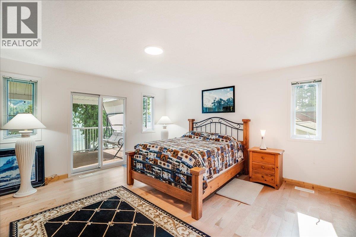 This 4 bedroom 3 bathroom family beach home on the North Shore is located 25 mins to the City of Nelson and is move-in ready! This home could also function as a second home and summer retreat/cottage. The main level is bright with high vaulted ceilings and includes a wall of windows offering incredible views of Kootenay Lake. The main level has an open flow for entertaining and access to the covered deck over looking Kootenay Lake. The primary bedroom is tucked away down the hallway on the main level. It has everything you need with an ensuite bathroom, walk-in closet and access to the covered patio that over looks Kootenay Lake. A guest room and a full guest bathroom complete the main floor. The lower level has 2 additional bedrooms, a large rec room with a cozy gas fireplace, a full bathroom, laundry room, large storage room and outdoor access from both the patio doors and a side door. Everything is fresh with new engineered hardwood flooring and paint throughout most of the house. The property also offers a dock, boat ramp, 3 bay covered parking large enough for recreational vehicles, a brand new hot water tank, a detached heated garage/shop, an outdoor detached bathroom (perfect for outdoor beach entertaining) and a large fenced in garden area. The 1.23 Acre lot is mostly useable flat land with development potential and offers approximately 100ft of waterfront. It's important to note that driveway is easy access with a nice grade. Amenities are close by; Balfour Golf Course, Balfour Beach Regional Park, Balfour Suprette covenience store, Old World Bakery, The Landing Pub/Restaurant, Gas Station, Balfour BC Ferries to Crawaford Bay are all within a 5 min drive. Ainsworth Hot Springs Resort is a short 15 min drive. (id:60292)